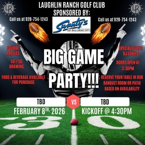 Join us at Laughlin Ranch Golf Club for our Big Game Party, sponsored by Swanty’s of Bullhead City. Watch the biggest football matchup of the year on the big screens while enjoying great food, drinks, and a lively game-day atmosphere.