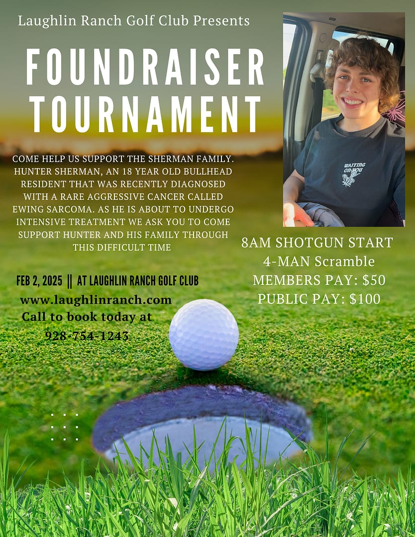 Help out a local family in need of support for cancer treatments. Hunter is an 18-year-old and was recently diagnosed with Ewing sarcoma. All proceeds go directly to Hunter and all players will receive a free t-shirt. This fundraiser tournament will happen on February 2, 2025, 8AM shotgun at Laughlin Ranch, with free lunch and raffle prizes.