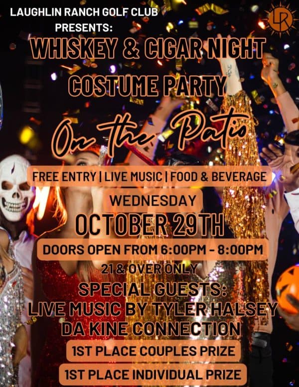 Celebrate the season at Laughlin Ranch Golf Club’s Whiskey & Cigar Night Costume Party on Wednesday, October 29th, from 6:00pm to 8:00pm. Open to guests 21 and over, this free-entry event features food, drinks, live music by Tyler Halsey and Da Kine Connection, and a festive costume contest with prizes for both couples and individuals.