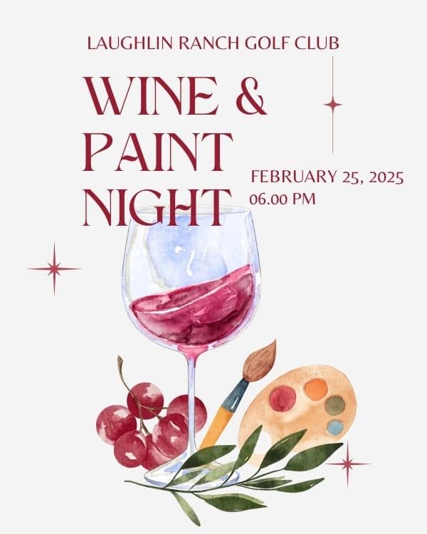 Sip, paint, and unwind at Laughlin Ranch on February 25 at 6 PM! Enjoy a fun-filled evening of creativity with a glass of wine in hand.