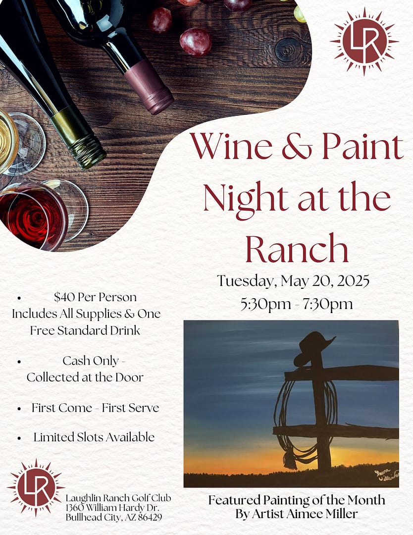 Sip, paint, and unwind at Laughlin Ranch on May 27 at 5:30PM! Enjoy a fun-filled evening of creativity with a glass of wine in hand.