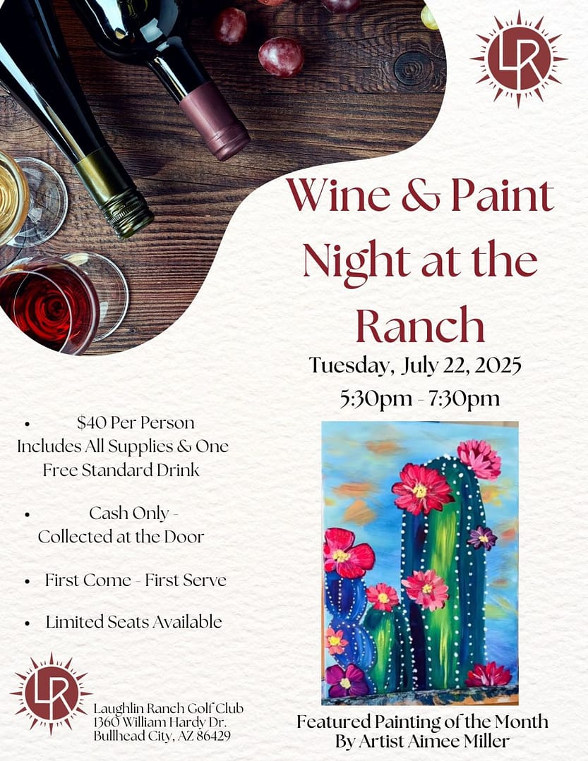 Sip, paint, and unwind at Laughlin Ranch on July 22 at 5:30PM! Check out the poster below for more details.