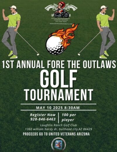FeaturedLaughlin Ranch Golf Club 1360 William Hardy Dr, Bullhead City, AZ, United StatesGrab your clubs and your crew!Join us for the 1st Annual Fore the Outlaws Golf Tournament — a 4-man scramble shotgun start at 8:30 AM on May 10, 2025.$100 per player | Proceeds benefit United Veterans Arizona Call the Proshop at 928-754-1243 to book your spot now.Let’s tee off for a cause!