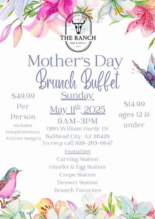 FeaturedLaughlin Ranch Golf Club 1360 William Hardy Dr, Bullhead City, AZ, United StatesCome spend Mother's Day on May 11, 2025, from 9am-3pm up at The Ranch Bar & Grill for the best food, cocktails and views in town! Now accepting reservations, book ASAP to secure your table and create wonderful Mother's Day memories with your loved ones. Enjoy carving, omelet & egg, crepe, dessert stations with brunch favorites […]