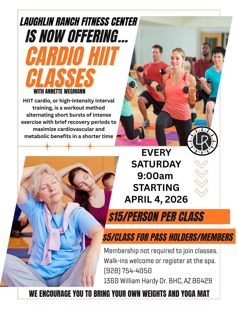 Starting April 4, 2026, Laughlin Ranch Fitness Center will offer Cardio HIIT Classes with Annette Wegmann every Saturday at 9:00 AM. This high-intensity interval training workout alternates short bursts of exercise with recovery periods for an efficient, energizing fitness session. Classes are $15 per person, or $5 for pass holders and members. No membership is required, and walk-ins are welcome. Register at the spa or call (928) 754-4050 for details.