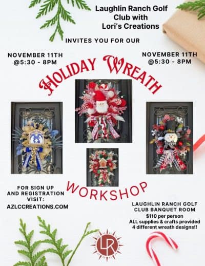 FeaturedLaughlin Ranch Golf Club 1360 William Hardy Dr, Bullhead City, AZ, United StatesGet festive and creative this season at our Holiday Wreath Workshop hosted by Laughlin Ranch Golf Club and Lori’s Creations! Join us on November 11th from 5:30–8:00 PM at the Laughlin Ranch Banquet Room. For $110 per person, enjoy a fun evening of crafting with all supplies provided—featuring four unique wreath designs to choose from. […]