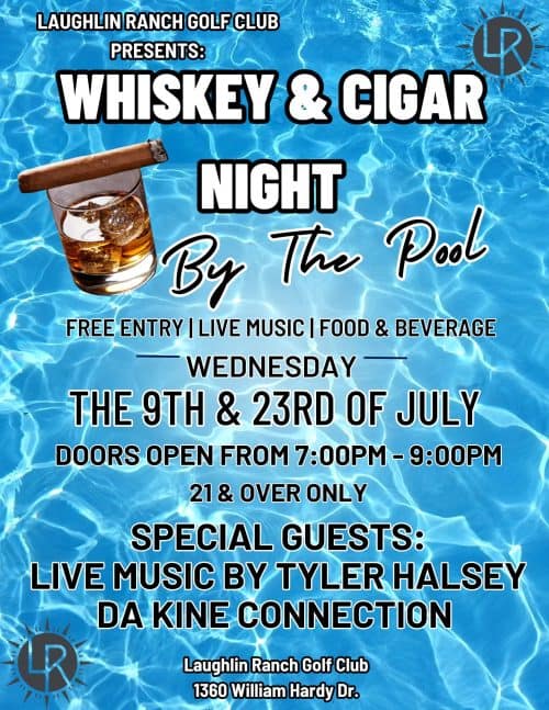 Featured Whiskey & Cigar Night By The PoolLaughlin Ranch Golf Club 1360 William Hardy Dr, Bullhead City, AZ, United StatesLaughlin Ranch Golf Club invites you to an unforgettable Whiskey & Cigar Night Pool Party on July 9 & 23, from 7:00-9:00PM to indulge in premium whiskey, fine cigars, and fun times. Enjoy free entry and live music by Tyler Halsey and Da Kine Connection. 21 and over only.